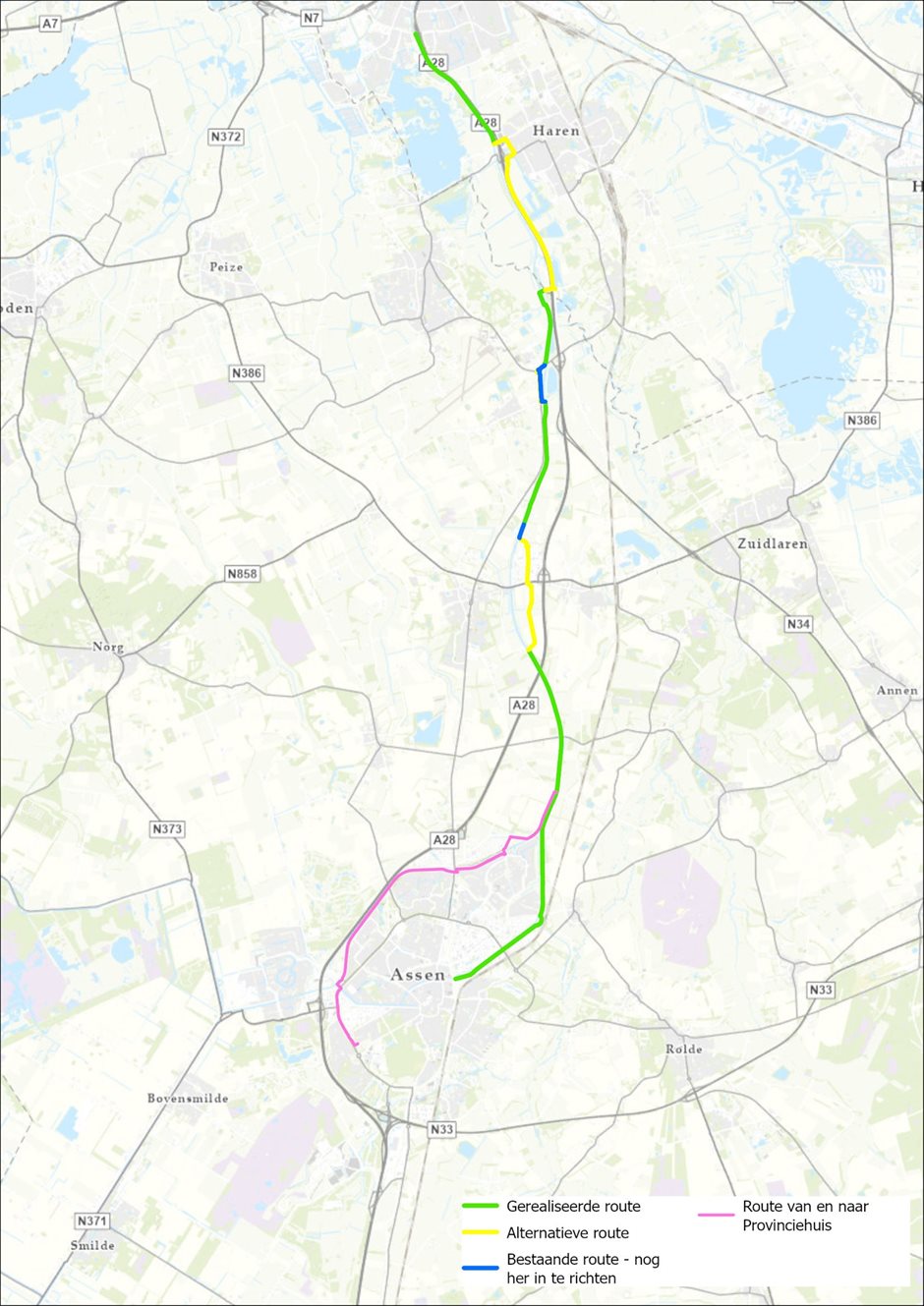Iets meer dan de helft van de doorfietsroute is al in gebruik. Op deze kaart staat welke delen van de route gerealiseerd zijn en welke delen van de route nog niet volgens het Beeldkwaliteitsplan van ‘De Groene As’ zijn ingericht maar wel gebruikt kunnen worden. De kaart is een gedetailleerde weergave van de huidige route en helpt je bij het plannen van de route tussen Groningen en Assen. Volg voor de alternatieve route (de delen die nog niet gerealiseerd zijn) de bewegwijzeringsborden. De borden zijn geplaatst in de eerste week van april 2022.