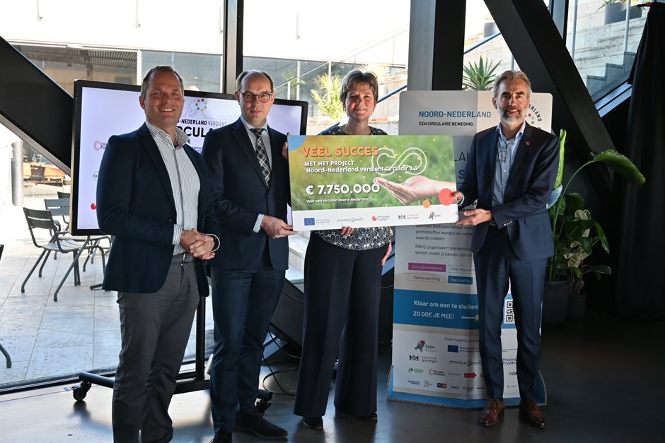Op 23 april ontving het project Noord-Nederland verdient Circulair (NNVC) € 7.750.000 miljoen Europese subsidie voor het versnellen en opschalen van de circulaire transitie in Noord-Nederland. De subsidie is toegekend door het Samenwerkingsverband Noord-Nederland (SNN) en komt uit het Europese Fonds voor Regionale Ontwikkeling (EFRO). Gedeputeerden Erik Jan Bennema en Willemien Meeuwissen van de provincies Groningen en Drenthe reikten de subsidie, mede namens de provincie Fryslân, uit.