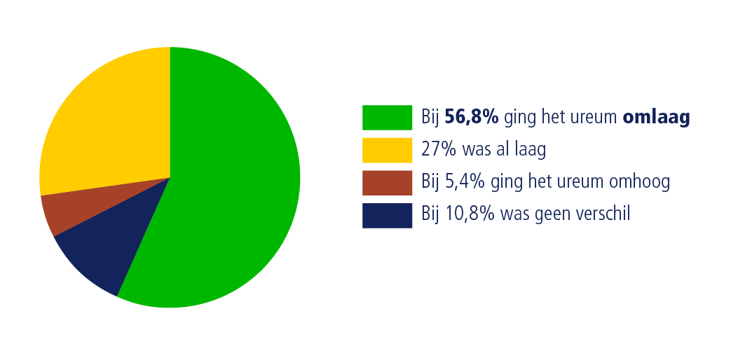 Ruim de helft van de ondernemers was in staat om het ureumgehalte verder omlaag te brengen. Ruim 10% had al een laagblijvend ureumgehalte. Bij iets minder dan 6% van de deelnemers ging het gehalte omhoog en bij bijna 30% was er geen noemenswaardig verschil.