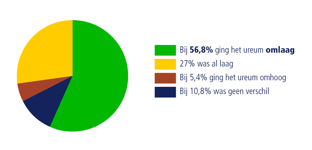 Ruim de helft van de ondernemers was in staat om het ureumgehalte verder omlaag te brengen. Ruim 10% had al een laagblijvend ureumgehalte. Bij iets minder dan 6% van de deelnemers ging het gehalte omhoog en bij bijna 30% was er geen noemenswaardig verschil.