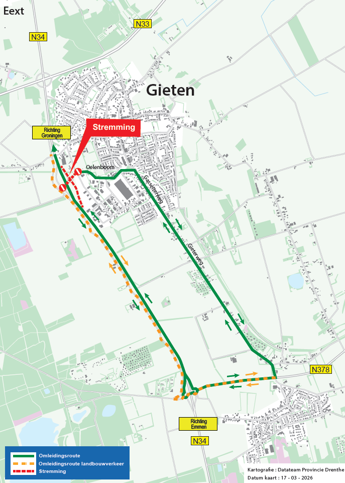 Bij het verkeersplein Gieten en op de N34 staan in 2026 meerdere werkzaamheden gepland om de verkeersveiligheid en de doorstroming te verbeteren. De plaatsing van de geleiderail aan de Oelenboom is daar één van. Later dit jaar komt er een verlengde busbaan aan de noord- en zuidzijde van het verkeersplein en een extra rijbaan (bypass) vanaf de N33 naar de N34.