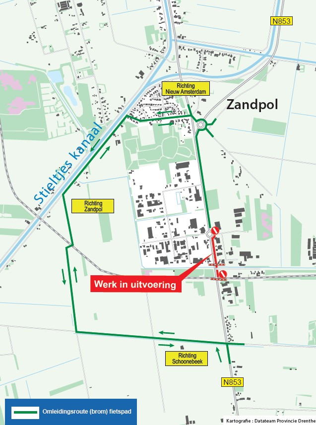 Het fietspad vanaf de rotonde in Zandpol tot aan de rotonde op industrieterrein De Vierslagen is van maandag 11 mei tot en met woensdag 10 juni 2026 afgesloten. Fietsers maken in deze periode gebruik van een omleidingsroute. Deze route staat met borden aangegeven.